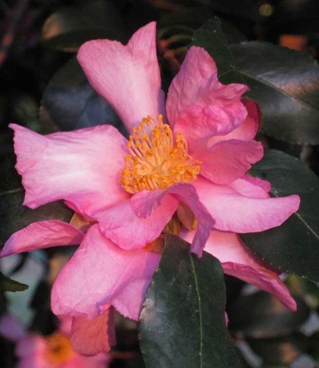 To prove how much of a gardener I am, I didn’t know that camellias were trees, or that they thrived around these parts. In my mind, they’ve always been the large bushes that live in cemeteries in the deep south and bloom in the dead of winter. Nevertheless, I’m happy to find that we’re the owners of several impressive camellia trees, most of them spread across the front porch of the house. There’s one in particular, at our front steps that probably hasn’t been pruned in twenty years. It’s shaggy and overgrown, but it’s blooming and the results are impressive: