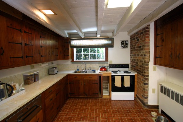 If there was an interior decorating style called “50’s country”, our kitchen would be a leading exemplar of the type. Brick pattern linoleum floors, wormy-wood cabinets with wrought-iron strap hinges, and ye olde appliances leave us yearning for the kitchen we left behind.