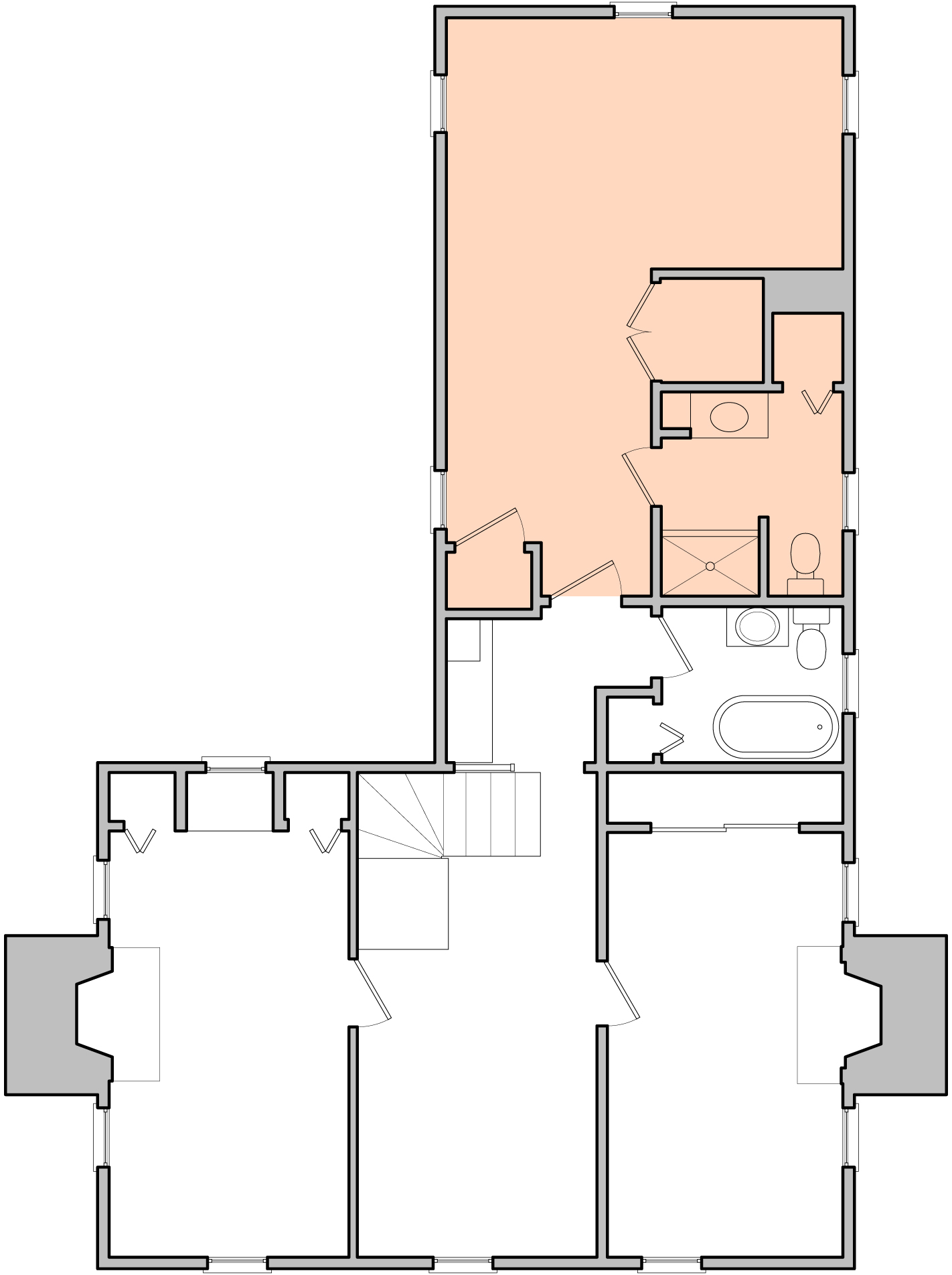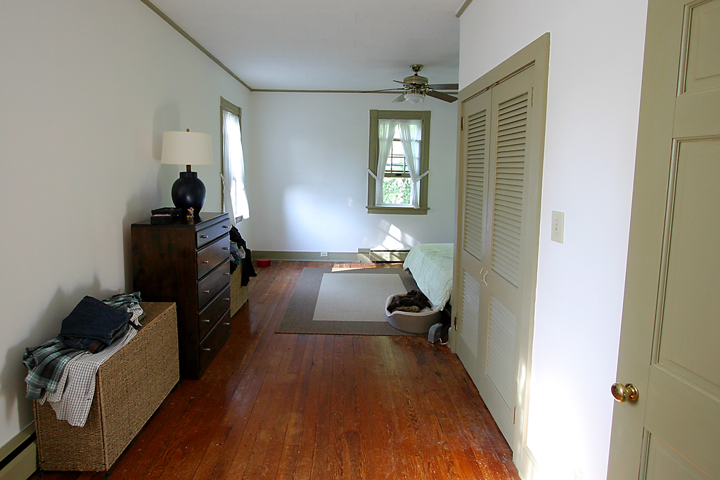 At nearly 23 feet long and 16 feet wide, the master is one of the largest spaces in the house, but it feels much smaller due to an awkward layout that forces the bed into a corner that measures only 8 by 10. The bathroom and closet occupy the southeast corner of the room, creating an L-shaped space that’s difficult to furnish efficiently. The long leg of the L is too wide to be a hallway, but too narrow to be home to anything other than a dresser. Louis uses this area to work through spastic bouts of puppy energy while we’re in the bathroom.