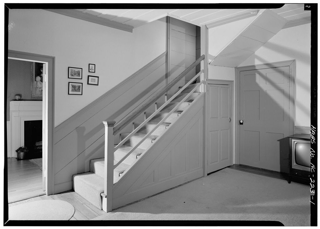 The ? room is located immediately adjacent to the front door, nestled between the living room and the library. It has identical dimensions to the west bedroom above it, 9′-6″ wide and a little over 19′ long. At the south end of the room, opposing doors define the path to the library. On the west side of the room is a fireplace with a mantel that matches the one in the living room next door. There’s a tall window on both the north and south wall, though both are shaded by porch roofs, resulting in a space that’s dimmer than you’d expect.