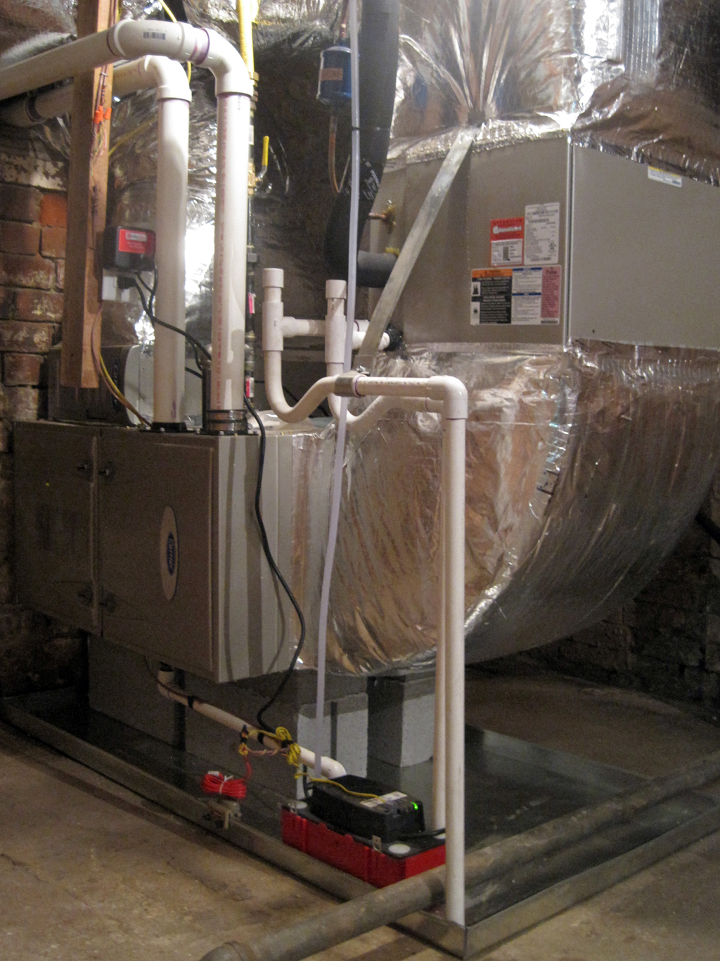 Based on the amused expression that spread across the HVAC contractor’s face at the mere mention of the words “heat pump” (he likened our house’s walls to the bottom of a colander), we opted for high-efficiency gas furnaces to provide heat. These units run at 96% efficiency, extracting residual heat from their own exhaust, and squeezing 96 cents worth of hot air out of every dollar we spend on natural gas (recall that our boiler was probably running at only half this efficiency). Additionally, the furnaces are two-stage, meaning that they can run in a “low” stage the majority of the time, saving fuel, decreasing wear on the equipment, and preventing too-quick temperature swings.